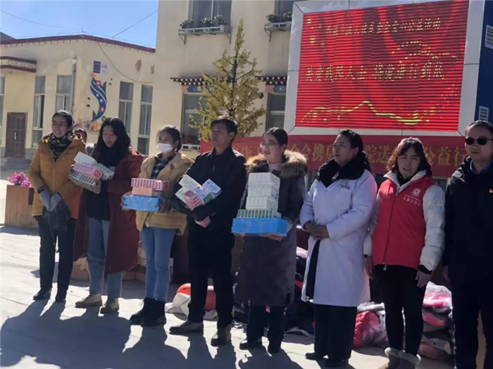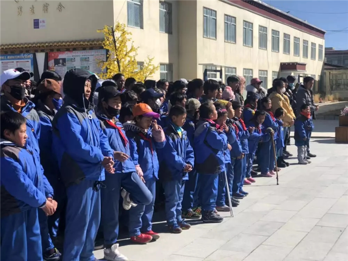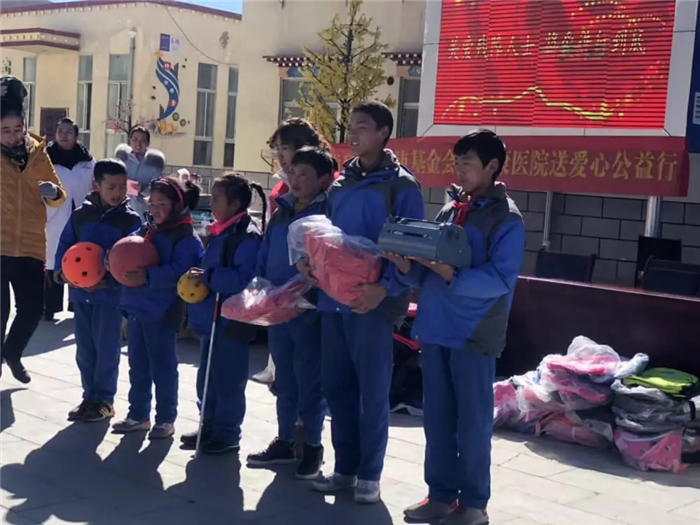 11月1日上午,西藏阜康天使基金會吉拉女士受西藏阜康醫(yī)療股份有限公司黨委書記、阜康天使基金會會長王斌先生,西藏阜康醫(yī)療股份有限公司總經(jīng)理、阜康天使基金會秘書長劉瀟瀟女士委托與西藏阜康醫(yī)院義診隊一起,攜價值一萬五千元的藥品和兩萬元的物資來到那曲市特殊教育學(xué)校,為這里的孩子們帶來了文化體育學(xué)習(xí)用品及藥品等物資。在特校校長次仁拉姆的組織下,特校師生列隊歡迎我們的到來,還精心準備了錦旗和潔白的哈達。