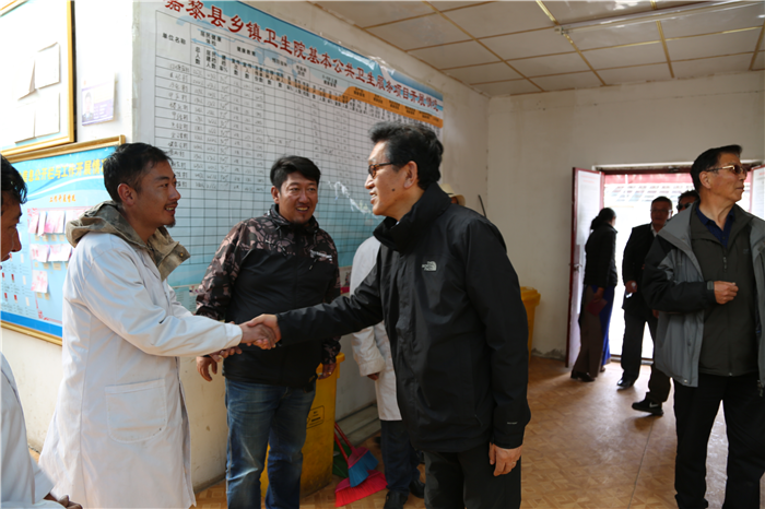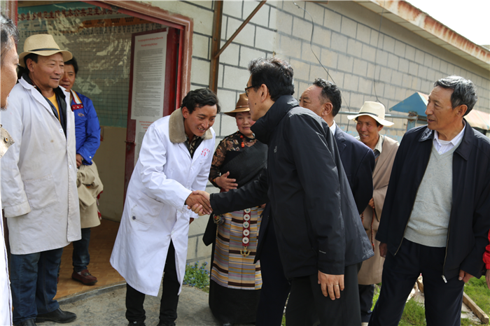 阿沛·晉源主席和施工人員一一握手慰問,囑咐他們在施工過程中一定注意安全!要把衛(wèi)生院建成標桿衛(wèi)生院,造福夏瑪鄉(xiāng)農(nóng)牧民群眾!看完即將竣工的衛(wèi)生院他又來到老舊的衛(wèi)生院看望正在工作的醫(yī)護人員,與醫(yī)護人員和患者親切握手交談,囑咐他們一定多加學習和培訓,用心工作,搬到新的衛(wèi)生院后一定不要辜負阜康全體員工的期望!接著晉源主席也指示阜康要繼續(xù)幫助衛(wèi)生院,切實提高衛(wèi)生院工作人員醫(yī)療水平,將夏瑪鄉(xiāng)衛(wèi)生院打造成全縣乃至全區(qū)的標桿衛(wèi)生院!