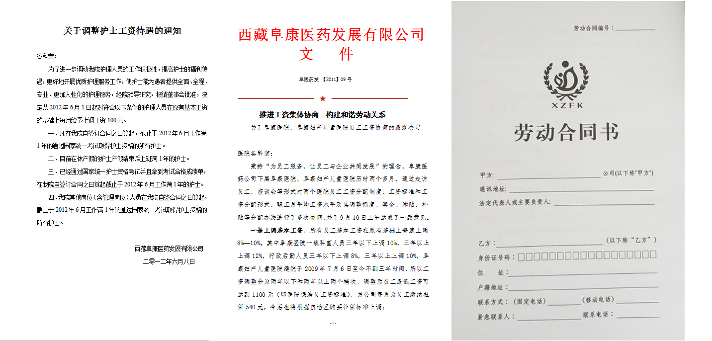 關(guān)于調(diào)整護(hù)士工資待遇的通知(左一)、推進(jìn)工資集體協(xié)商 構(gòu)建和諧勞動關(guān)系(左二)、勞動合同書(右一)